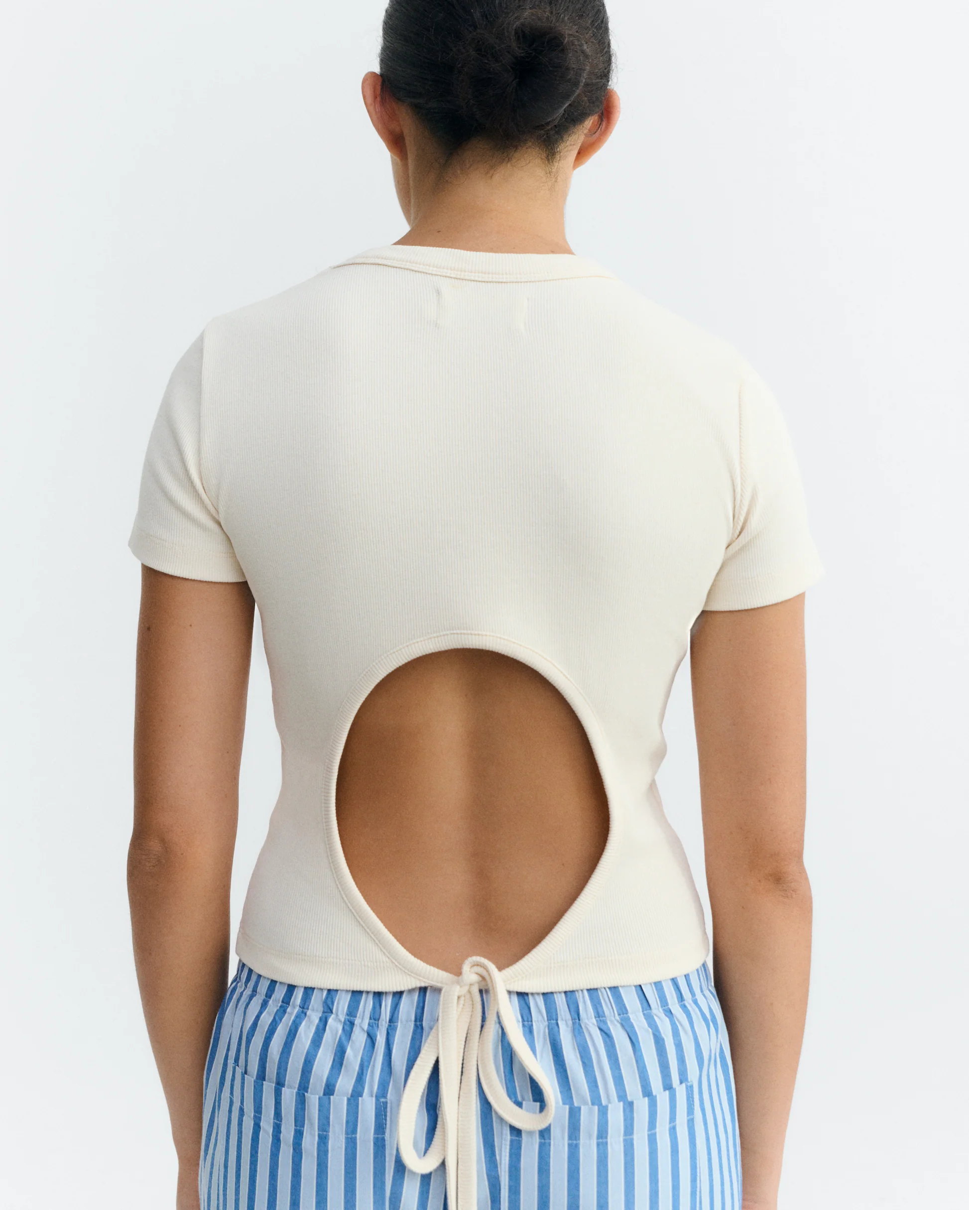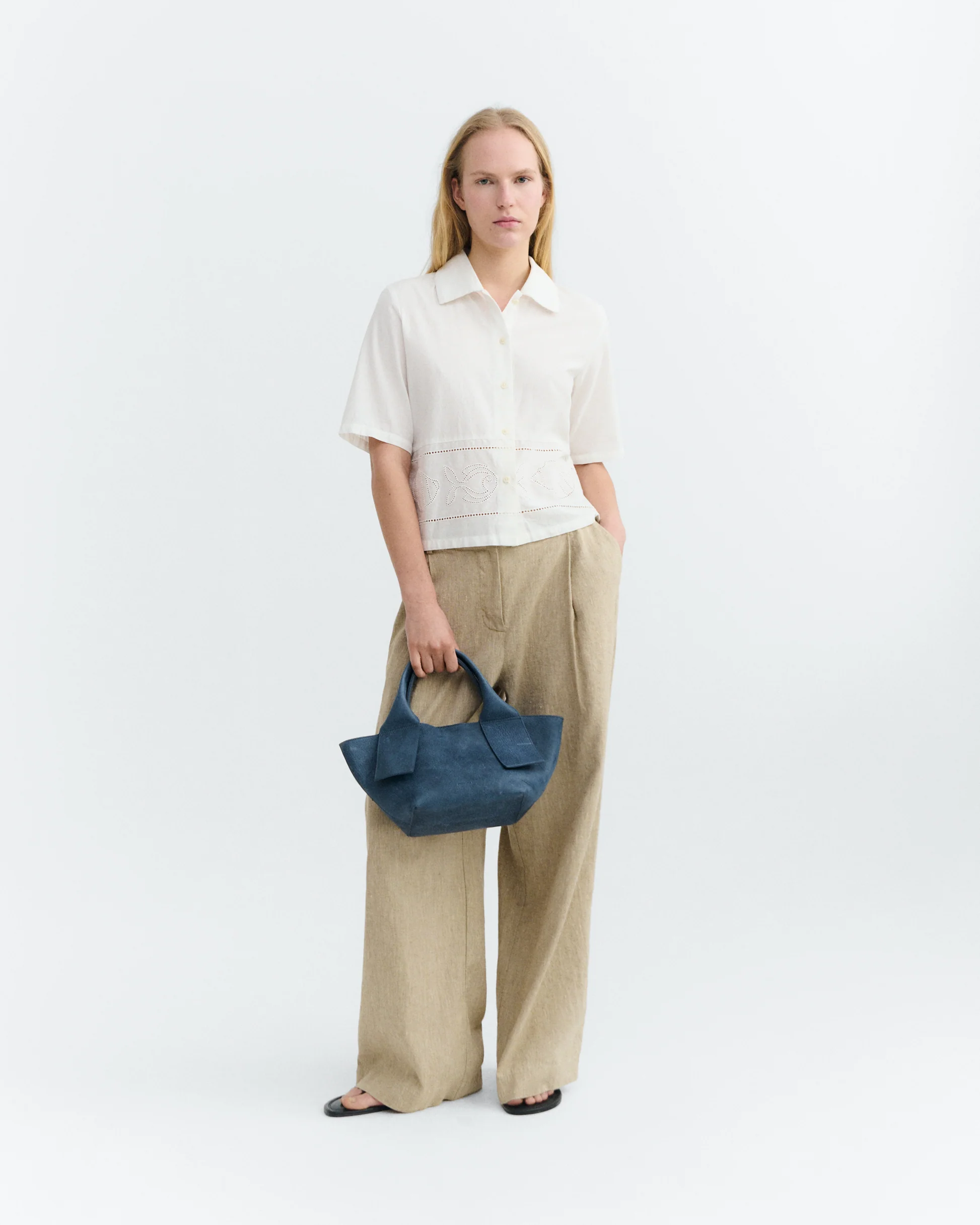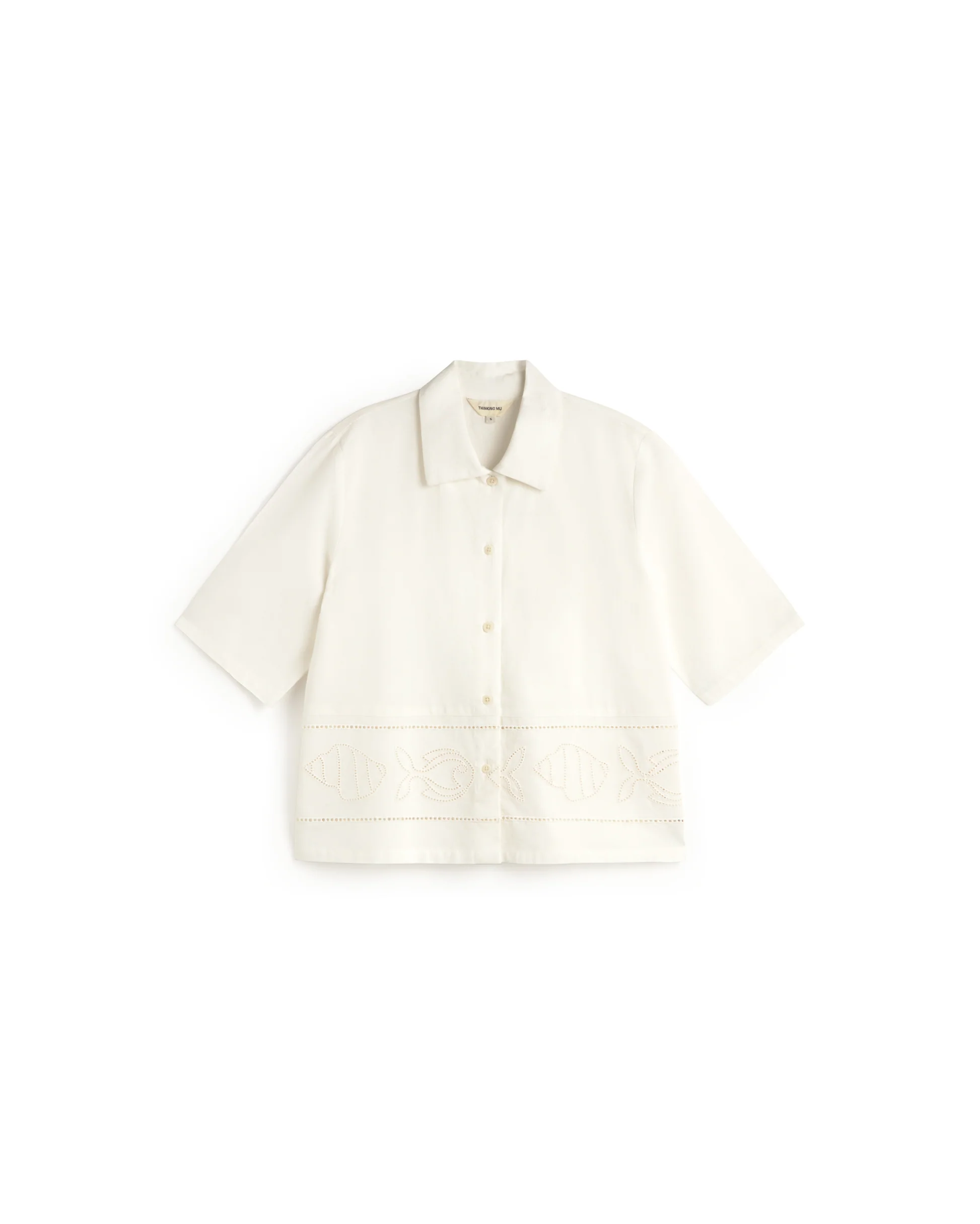 Chemise boxy aux épaules tombantes et manches courtes. Elle à une fermeture boutonnée et une poche patch frontale avec des fentes latérales apportant du mouvement au vêtement.