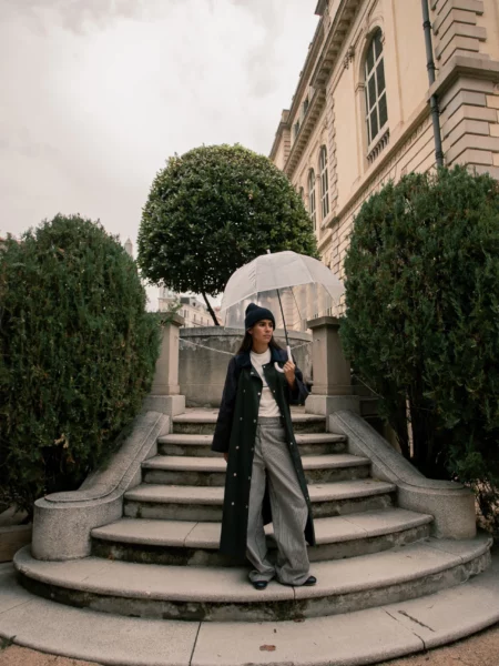 Laure a glissé une doublure rayée esprit costume pour créer un contraste cool et élégant c’est le détail caché qui rend la veste encore plus singulière. -