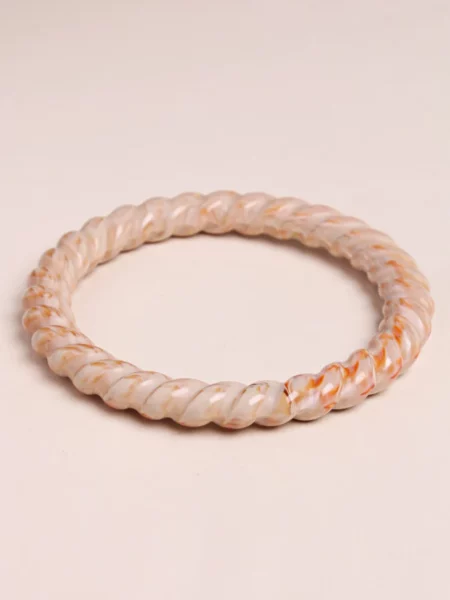 55,00€Un bracelet épais en acétate et joliment tressé, notre motif préféré. Une sublime couleur qui sera unique car variant selon l’un ou autre bracelet au coulage. Un mélange de beige et orange, comme un caramel macchiatto ou du miel doré. Su-blime. A porter seul ou avec des joncs plus fins.