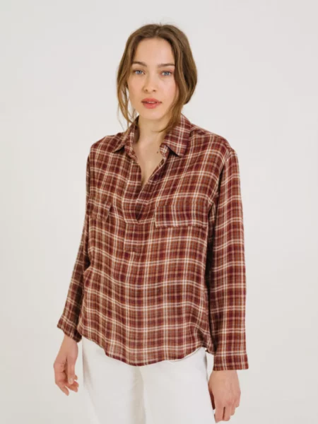 Chemise confectionnée dans un mélange de viscose et laine au toucher doux et fluide. Son col esprit vareuse, ses emmanchures basses et ses fentes côtés lui confèrent une allure décontractée et contemporaine. Les fausses poches poitrine et l’absence de boutonnage soulignent une esthétique minimaliste et épurée.