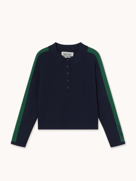 Polo en laine mérinos extra-fine sur fond bleu marine profond. Rayures vert bouteille le long des manches pour un look sophistiqué avec une touche sportive subtile. Col classique et finitions côtelées. Associez-le au pantalon assorti pour une tenue coordonnée. Conçu