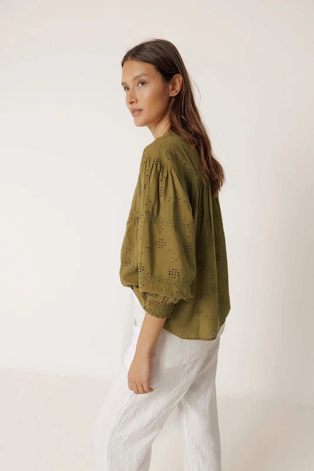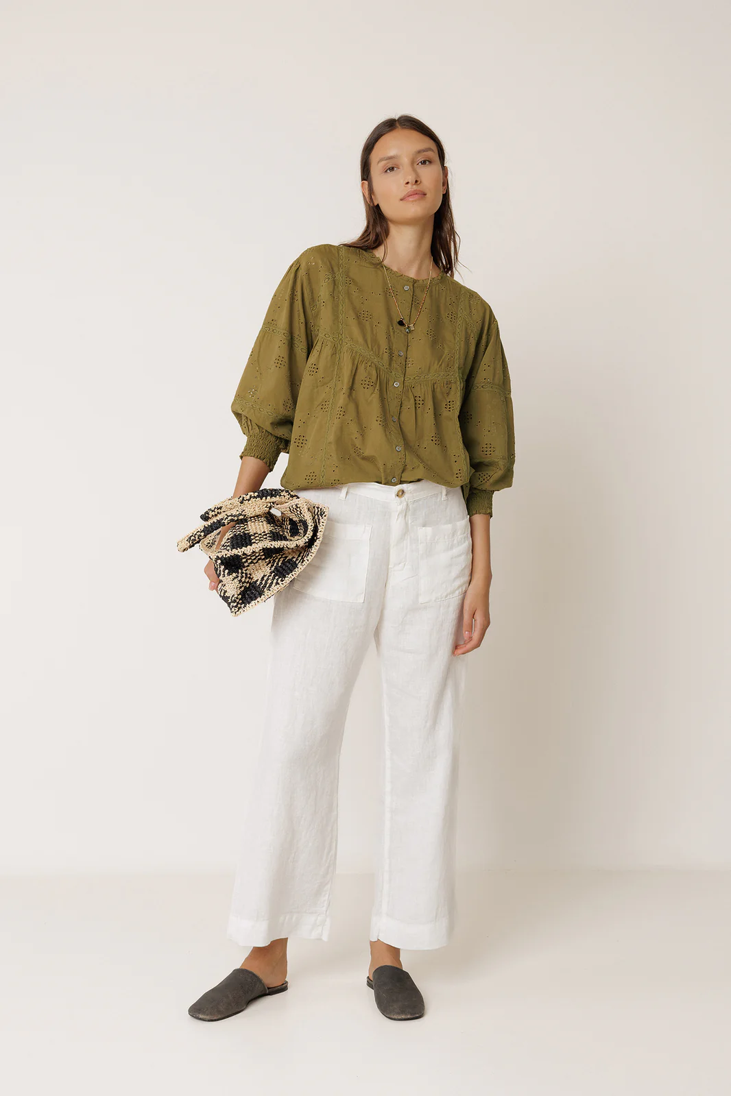 139,00€• Col montant et manches cloche avec finition ondulée. • Fermeture par boutonnière centrale. • Détails brodés découpés. • Tissu en voile de coton avec broderie suisse. • Coupe décontractée : conçue pour un porté légèrement ample. • Mesures de la taille S à plat : Longueur à partir des épaules: 59cm. Largeur du buste: 48cm. Largeur du bas: 54cm. Taille : +1cm en longueur par taille et +2cm pour les contours.