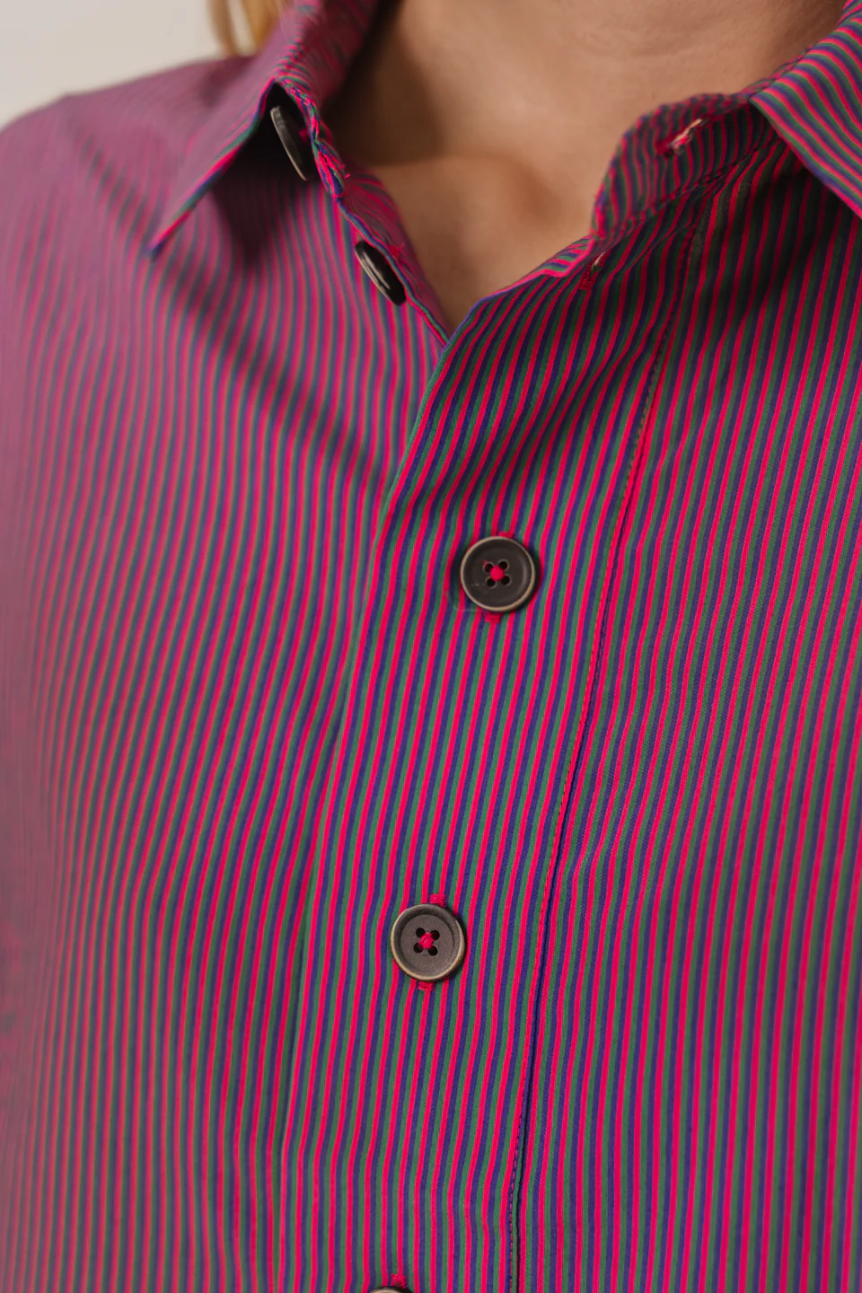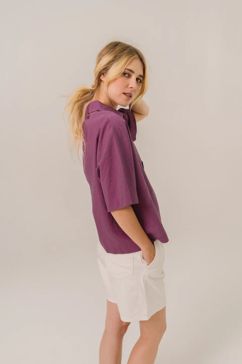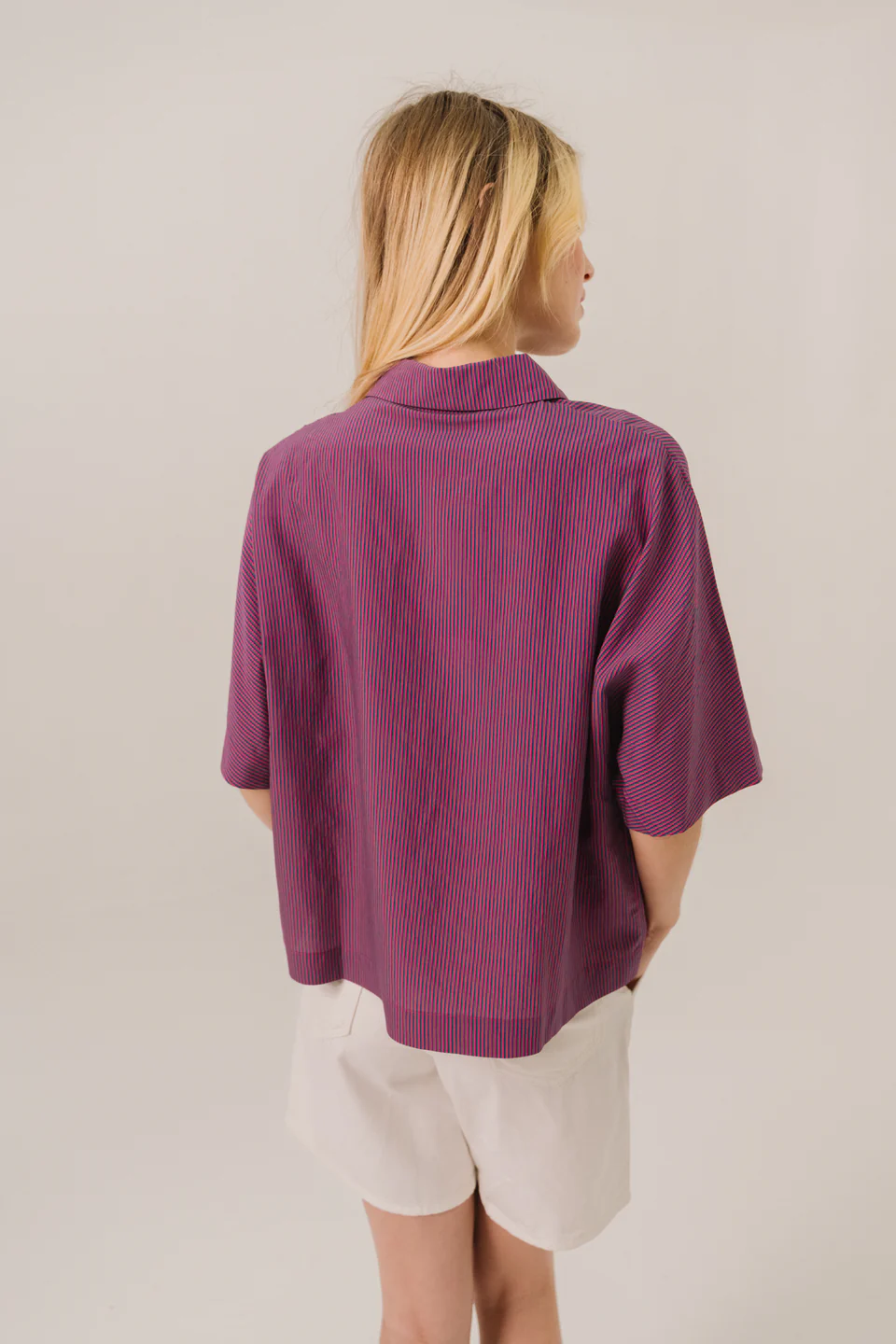 Top uni à manches courtes à fines rayures, inspiré de la vareuse. Col chemise, patte polo large et boutons apparents. Les manches kimono apportent confort et élégance décontractée.