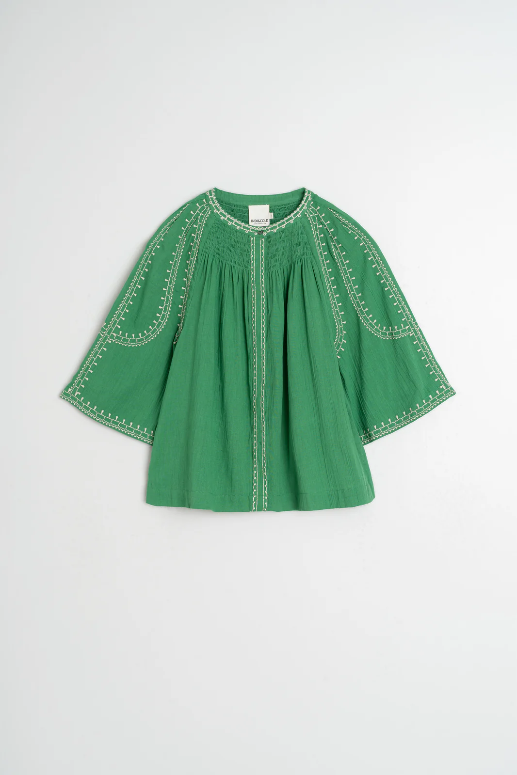 Chemise en gase de coton avec broderies éthniques contrastées. Des détails élastiques dans le corsage et des manches globes aveec des petits plis aux épaules. Elle a une fermeture frontale boutonnée cachée et un fit standard.