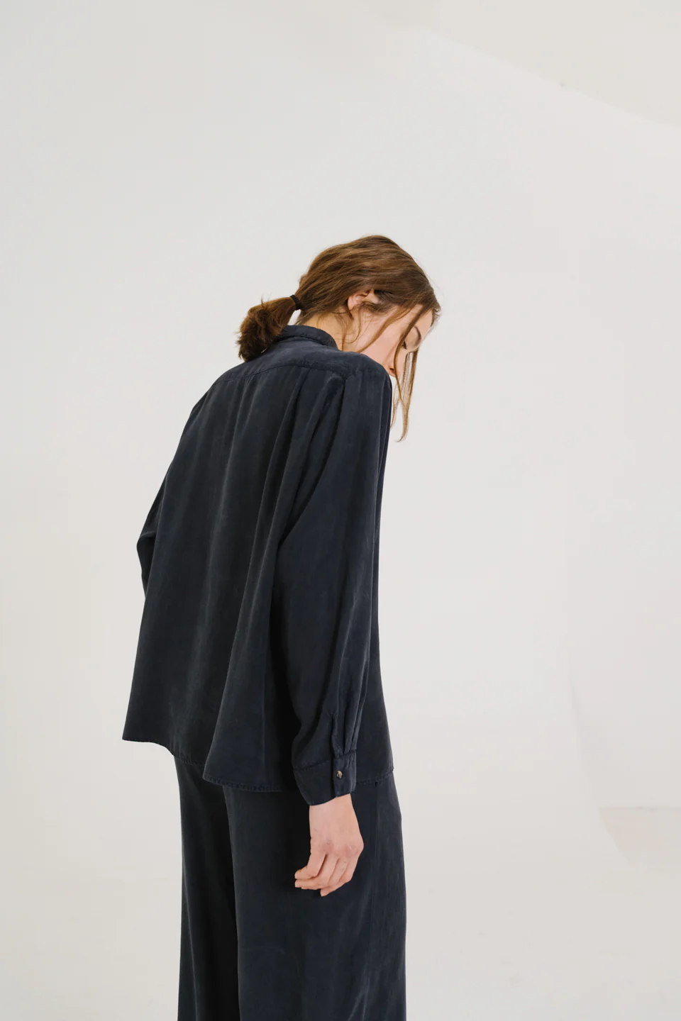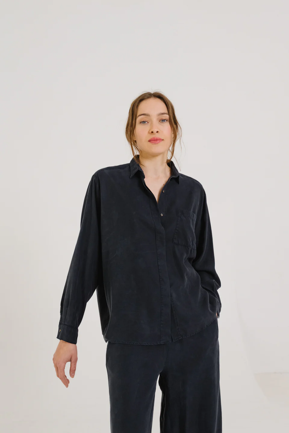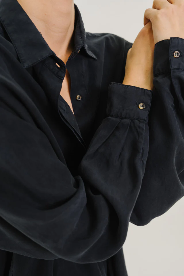 Chemise à manches longues, confectionnée en lyocell gris-bleu au tombé souple et fluide. Inspirée de la chemise d’homme, elle adopte une coupe oversize avec emmanchure basse pour une allure décontractée. Col classique, poche poitrine plaquée, boutonnage caché et poignets boutonnés en finition. Un empiècement au dos structure subtilement la silhouette.