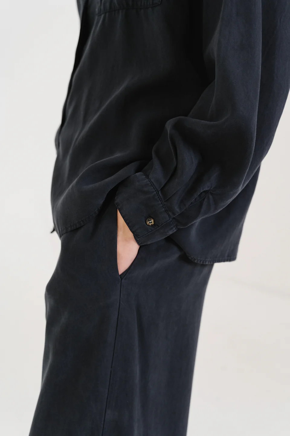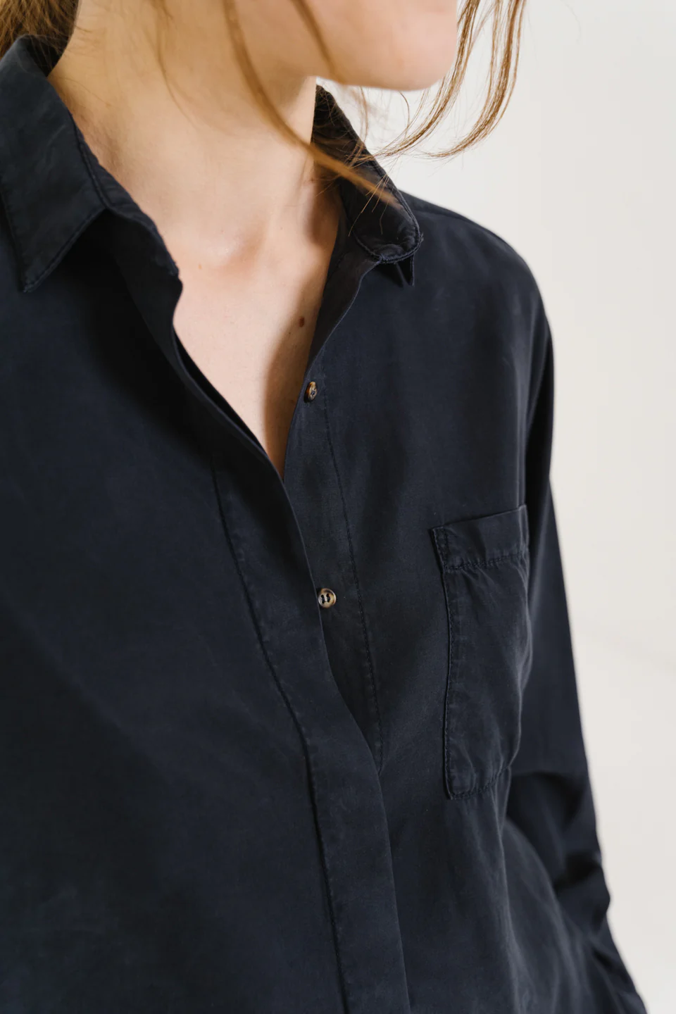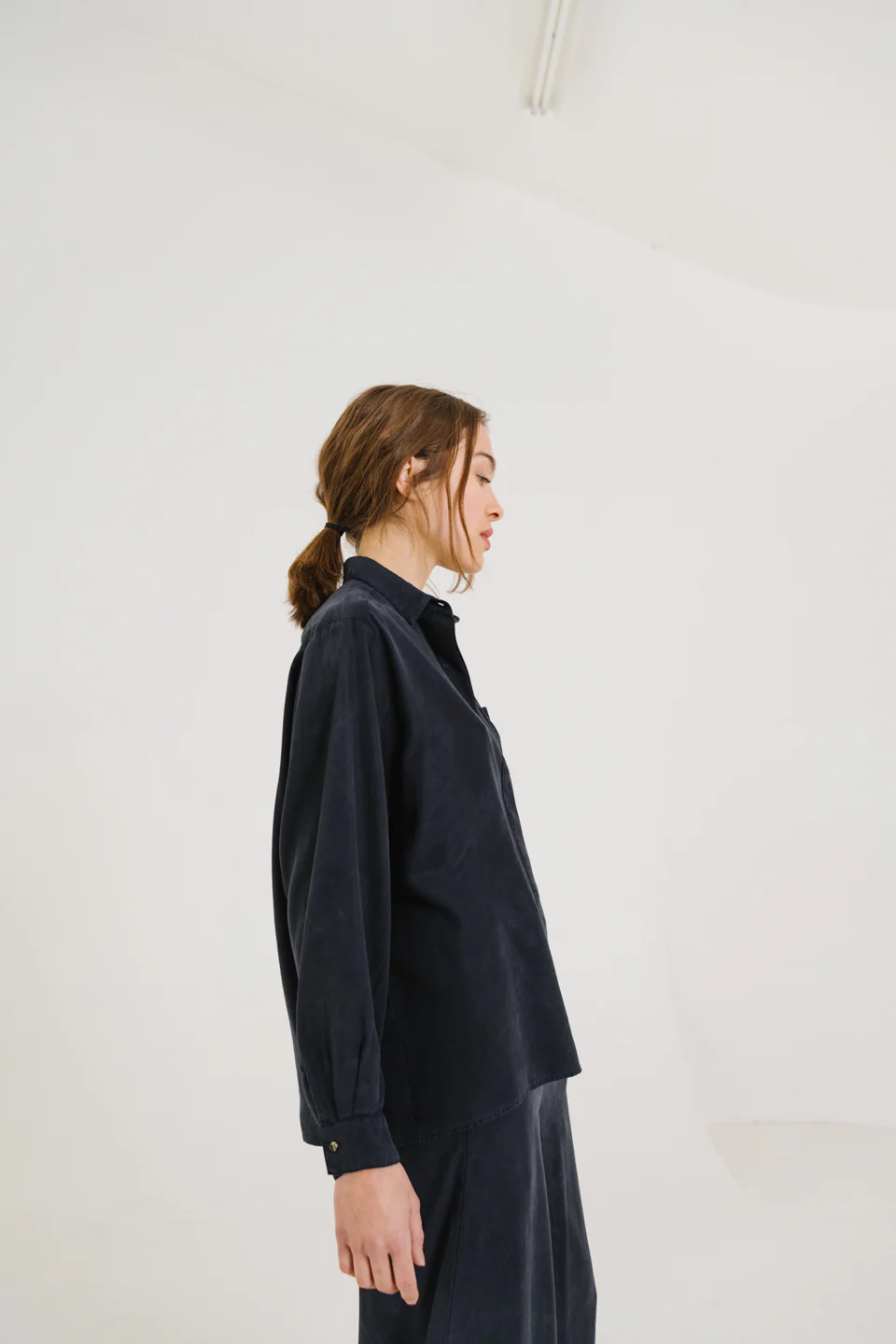 Chemise à manches longues, confectionnée en lyocell gris-bleu au tombé souple et fluide. Inspirée de la chemise d’homme, elle adopte une coupe oversize avec emmanchure basse pour une allure décontractée. Col classique, poche poitrine plaquée, boutonnage caché et poignets boutonnés en finition. Un empiècement au dos structure subtilement la silhouette.