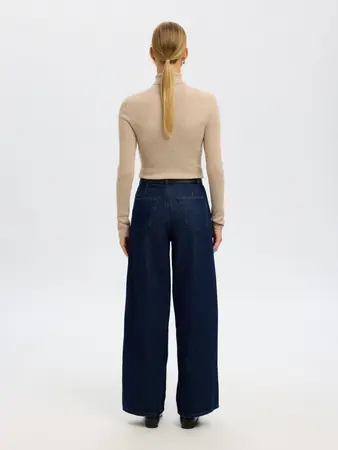 Jean taille haute avec coupe ample et jambes courbes. Fermeture zippée et boutonnée sur le devant. Modèle à cinq poches. Matière principale : mélange de coton biologique et de coton recyclé.