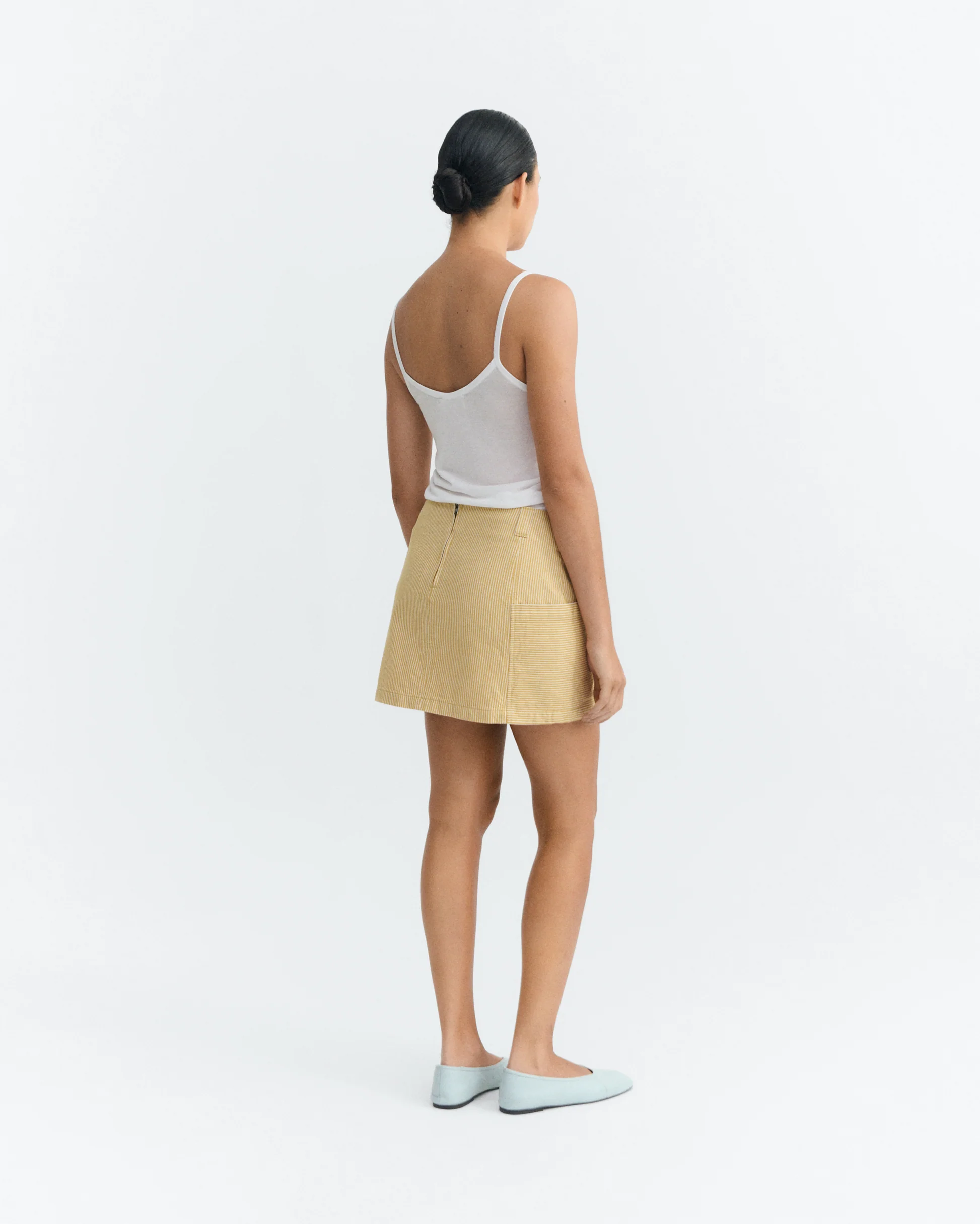Short court à rayures bicolores verticales, confectionné en gaze de coton tissée en France. Sa taille élastiquée, ajustable par un cordon, assure un confort optimal. Les poches discrètes dans la couture et le bas de vêtement biaisé dans la matière apportent une finition soignée. Une pièce légère et facile à porter