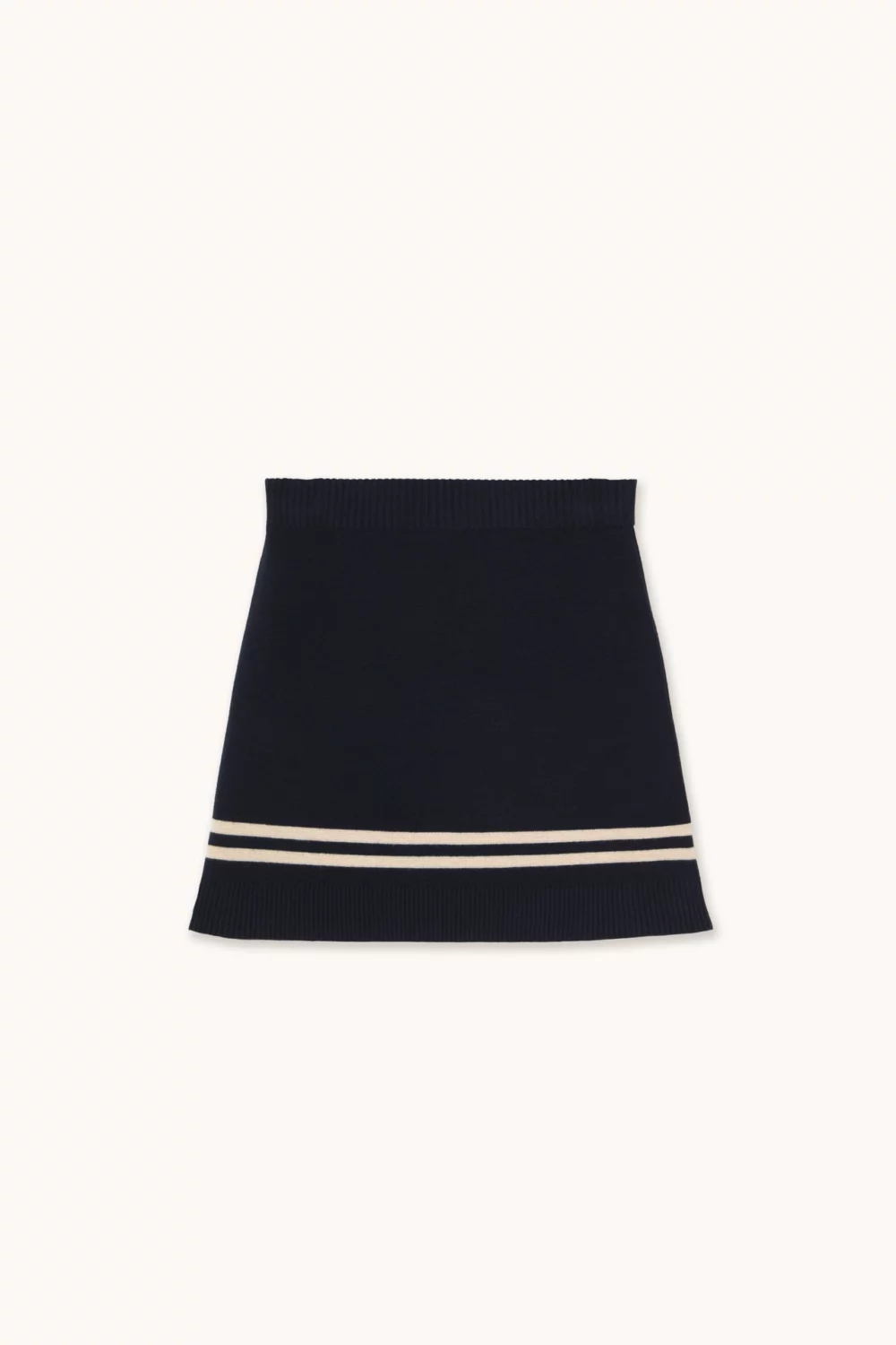 Jupe structurée en maille bleu marine, mélange laine et coton. Ceinture côtelée douce et ourlet contrasté. Silhouette ajustée, subtilement inspirée du style nautique.