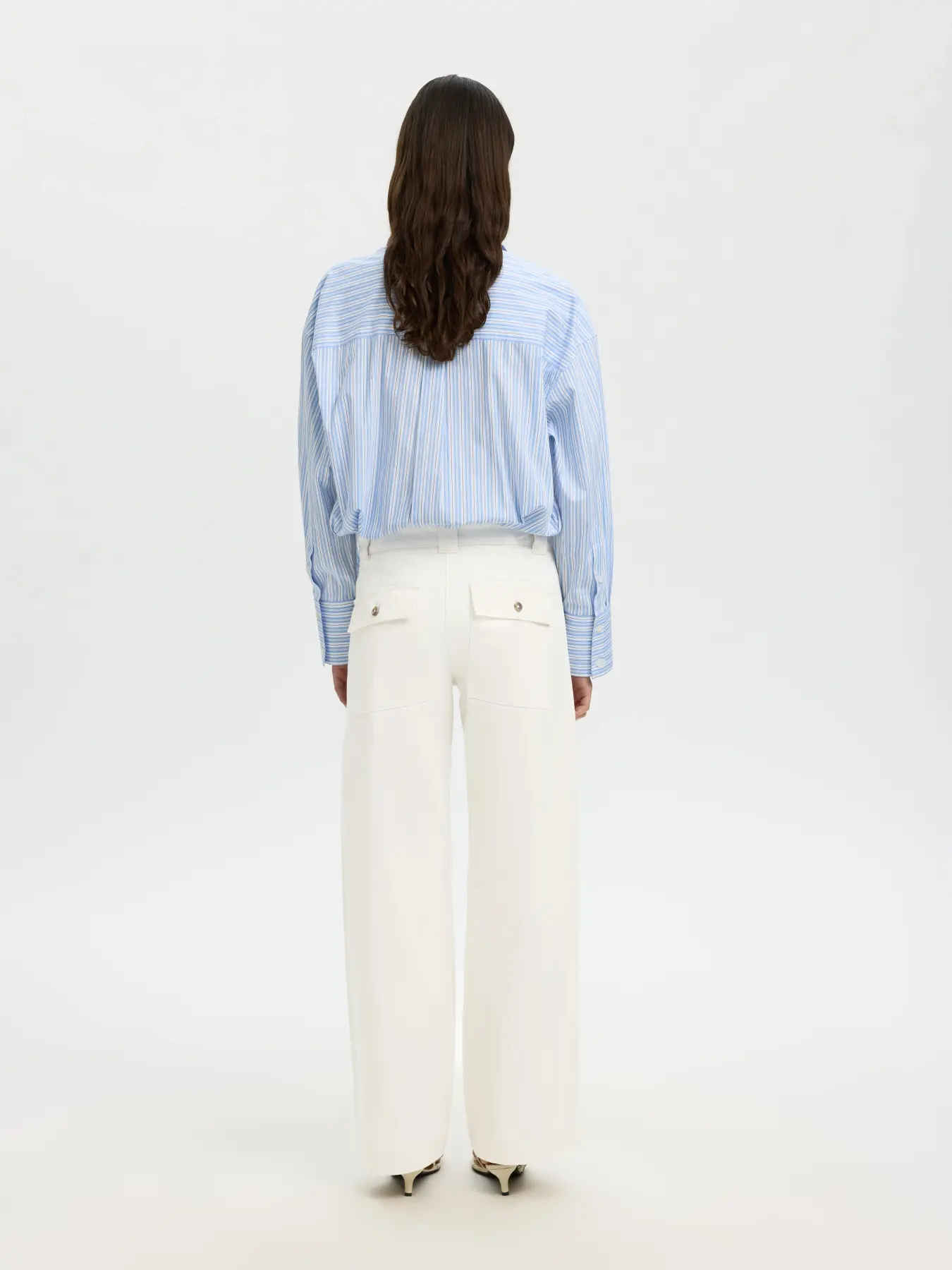 Pantalon à jambes larges coupe décontractée avec taille élastique et poches dans les coutures latérales. Tissu stretch en polyester recyclé, polyester, viscose et élasthanne mélangés. Ce produit est certifié GRS. Chaque étape de la chaîne d’approvisionnement a répondu à des exigences sociales, environnementales et chimiques strictes.