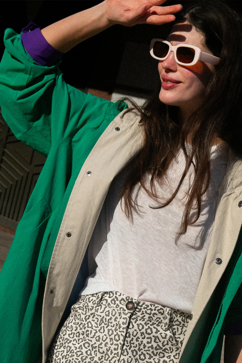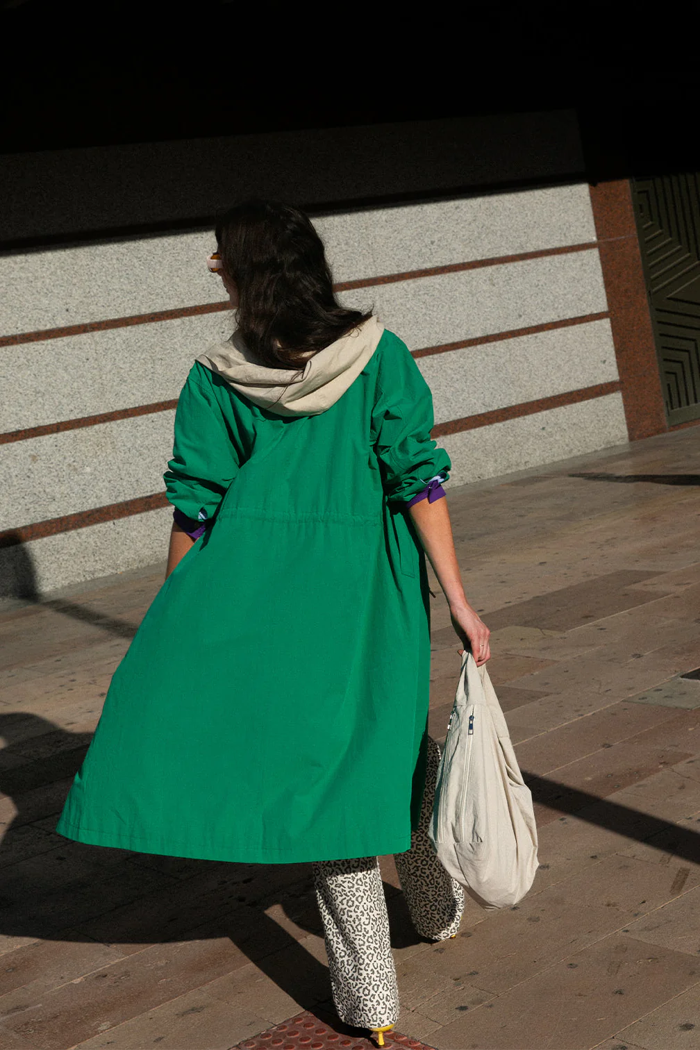 Une coupe longue et généreuse mais bien dosée, un vert franc qui attire la lumière, une doublure beige claire qui contraste subtilement. Elle suit les mouvements, encadre la silhouette, et donne de l’allure dès qu’on sort.