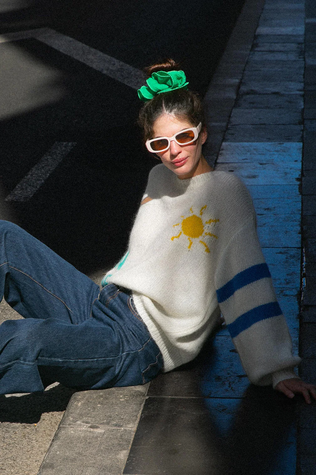 Une maille duveteuse, douce sur la peau, une coupe large et confortable, et un motif tricoté qui fait sourire : un soleil jaune à gauche, deux bandes bleues sur les manches, et un mot qui résume tout : SUNSHINE.
