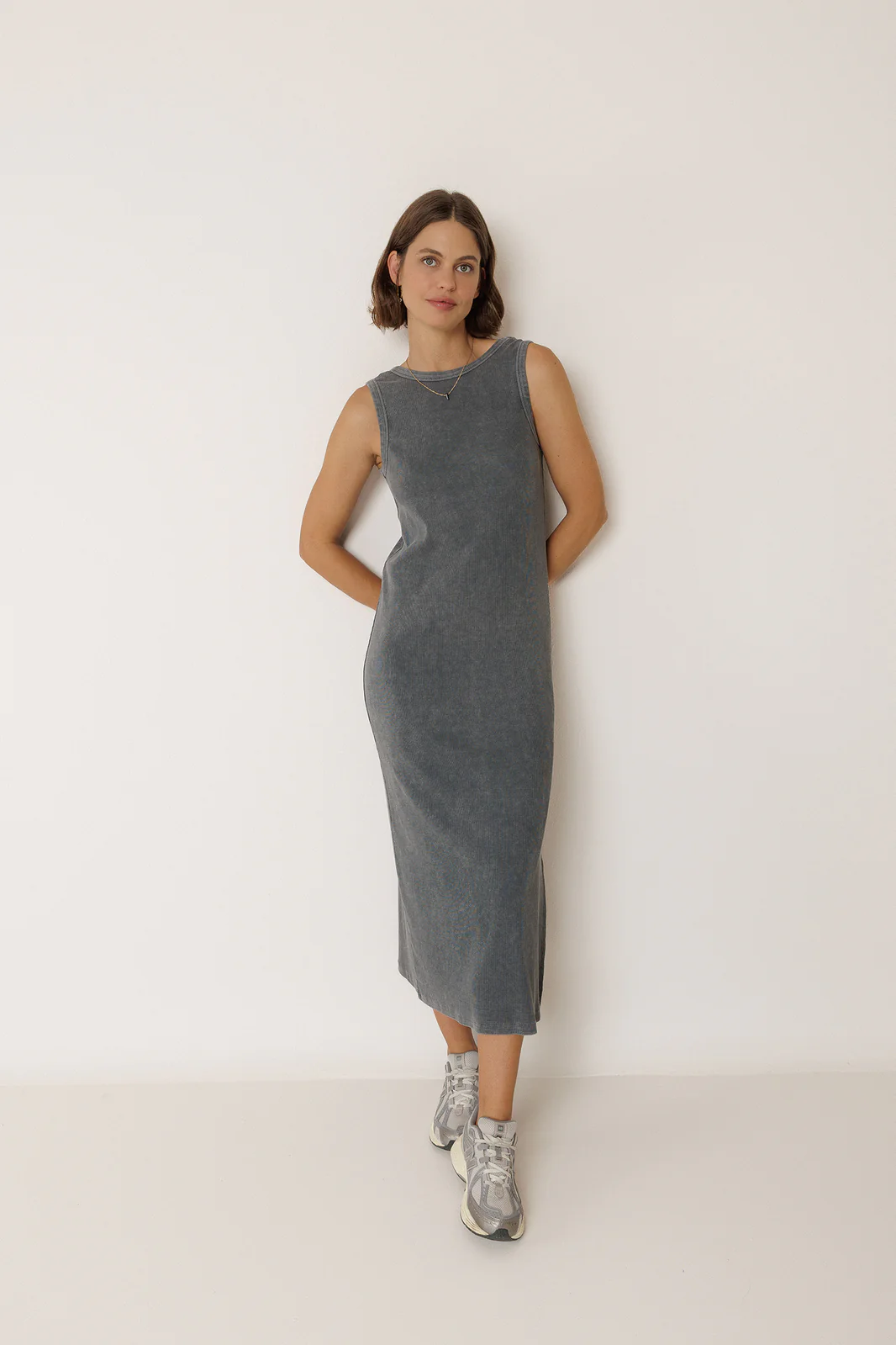Robe longue en coton à bretelles. Un col rond devant, et plus prononcé dans le dos. Une longueur maxi et une fente latérale. Parfaite pour la vie quotidienne.