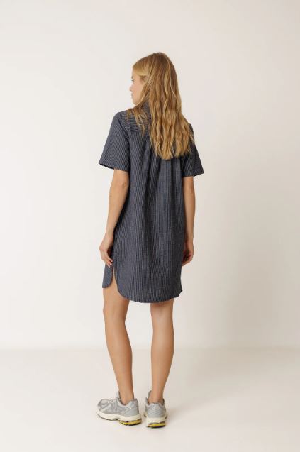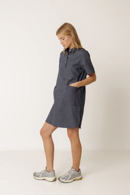 Robe Col polo avec fermeture à boutons. • Manches courtes et maxi-poches plaquées. • Petites ouvertures latérales dans le bas. • Tissu rayé en coton biologique. • Coupe décontractée : conçue pour un porté légèrement ample. • Mesures de la taille S à plat : Longueur à partir des épaules: 90cm. Largeur du buste: 51cm. Largeur du bas: 59cm.
