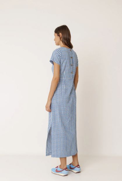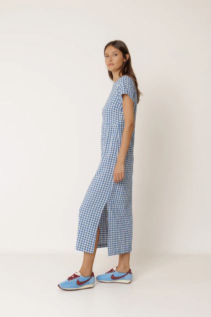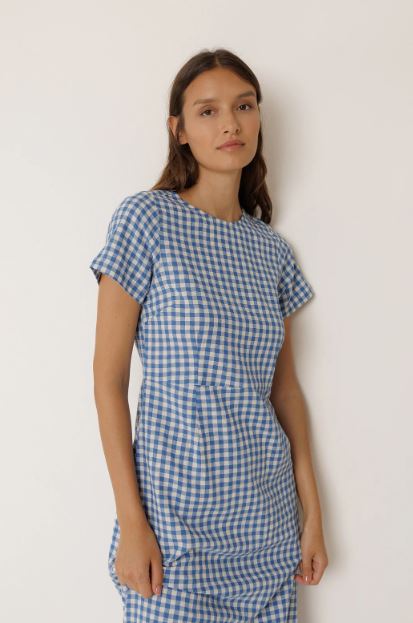 Robe longue en coton à carreaux vichy au col rond et avec une fermeture boutonnée dans le dos. Ceinture ajustée à la taille et jupe droite avec slim fit, faite pour être portée ajustée.
