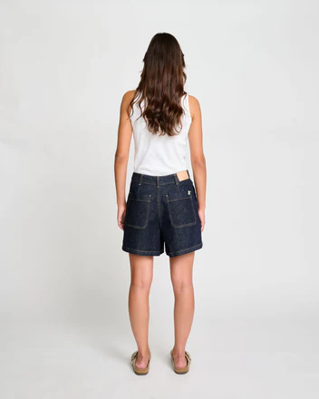 Short court à rayures bicolores verticales, confectionné en gaze de coton tissée en France. Sa taille élastiquée, ajustable par un cordon, assure un confort optimal. Les poches discrètes dans la couture et le bas de vêtement biaisé dans la matière apportent une finition soignée. Une pièce légère et facile à porter