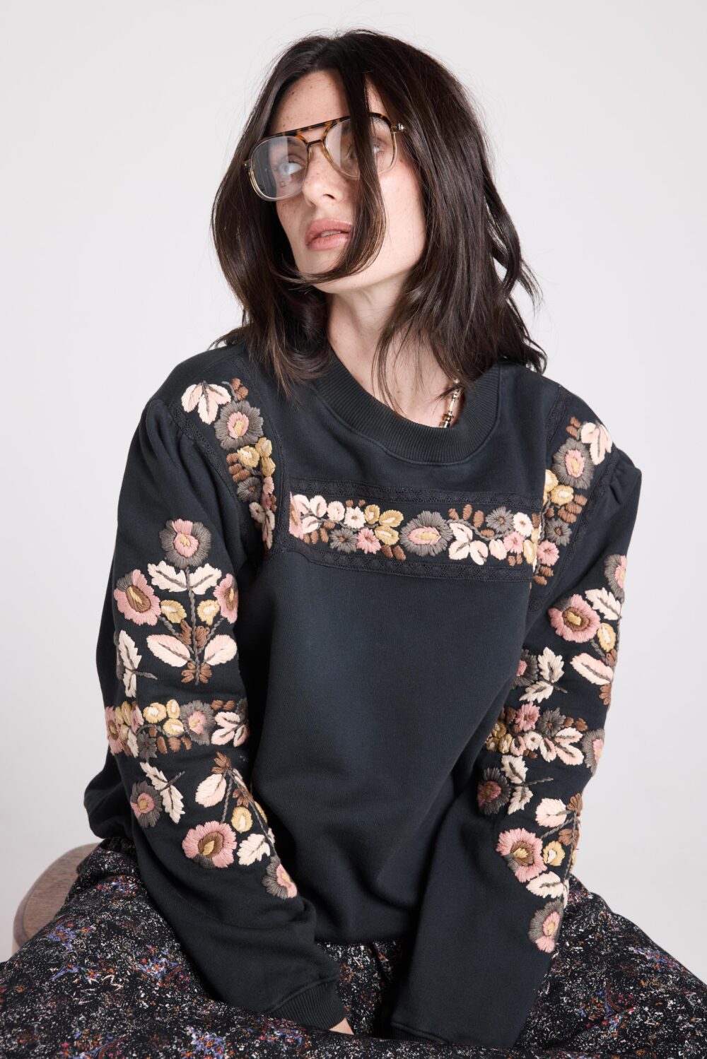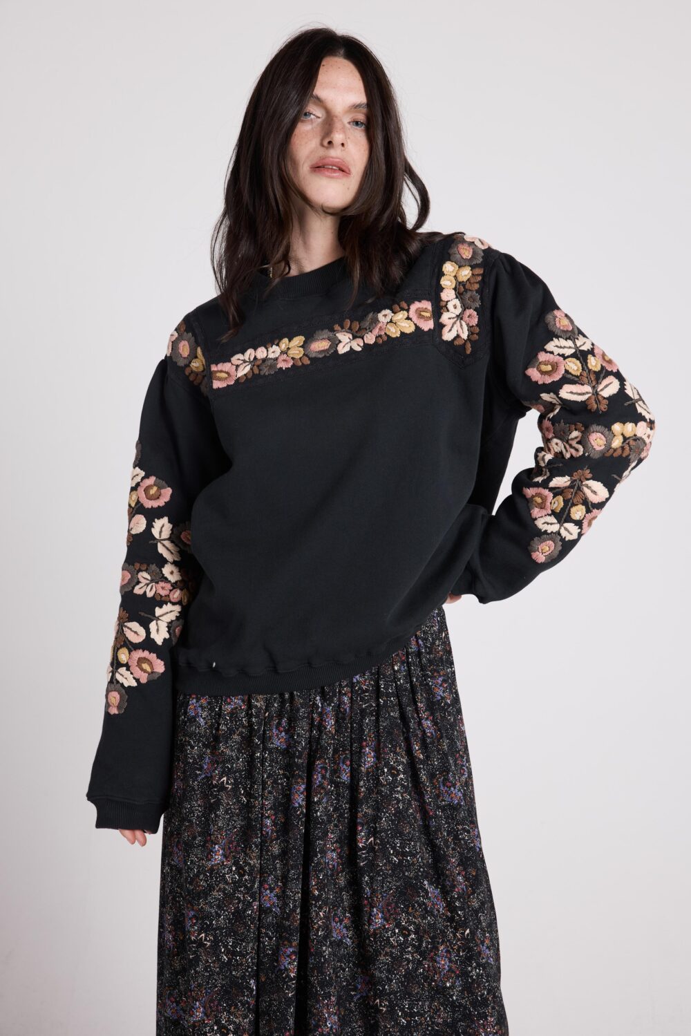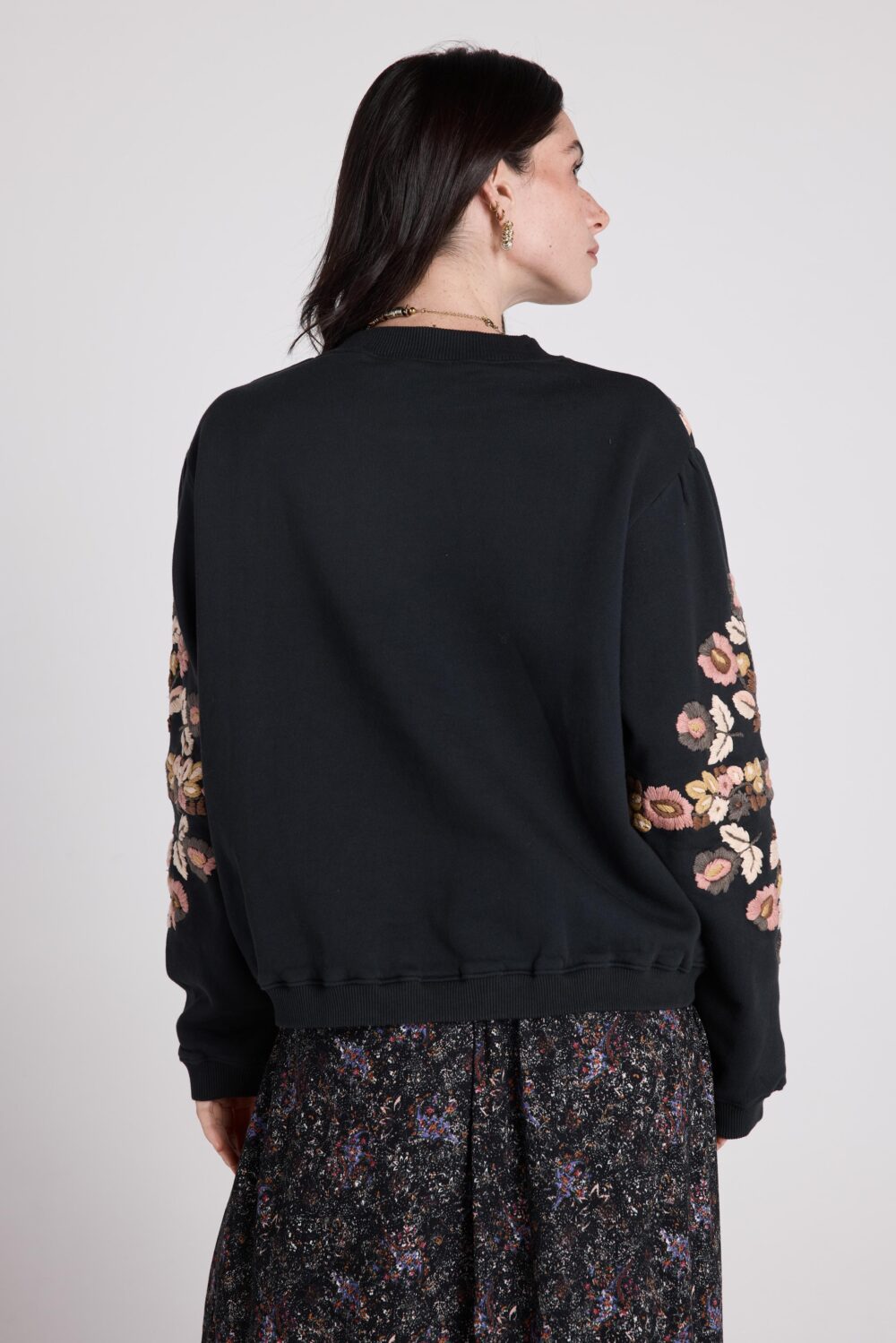 ISTOIRE est un sweat brodé de fleurs colorées sur le buste et les manches, pour une allure décontractée et travaillée.