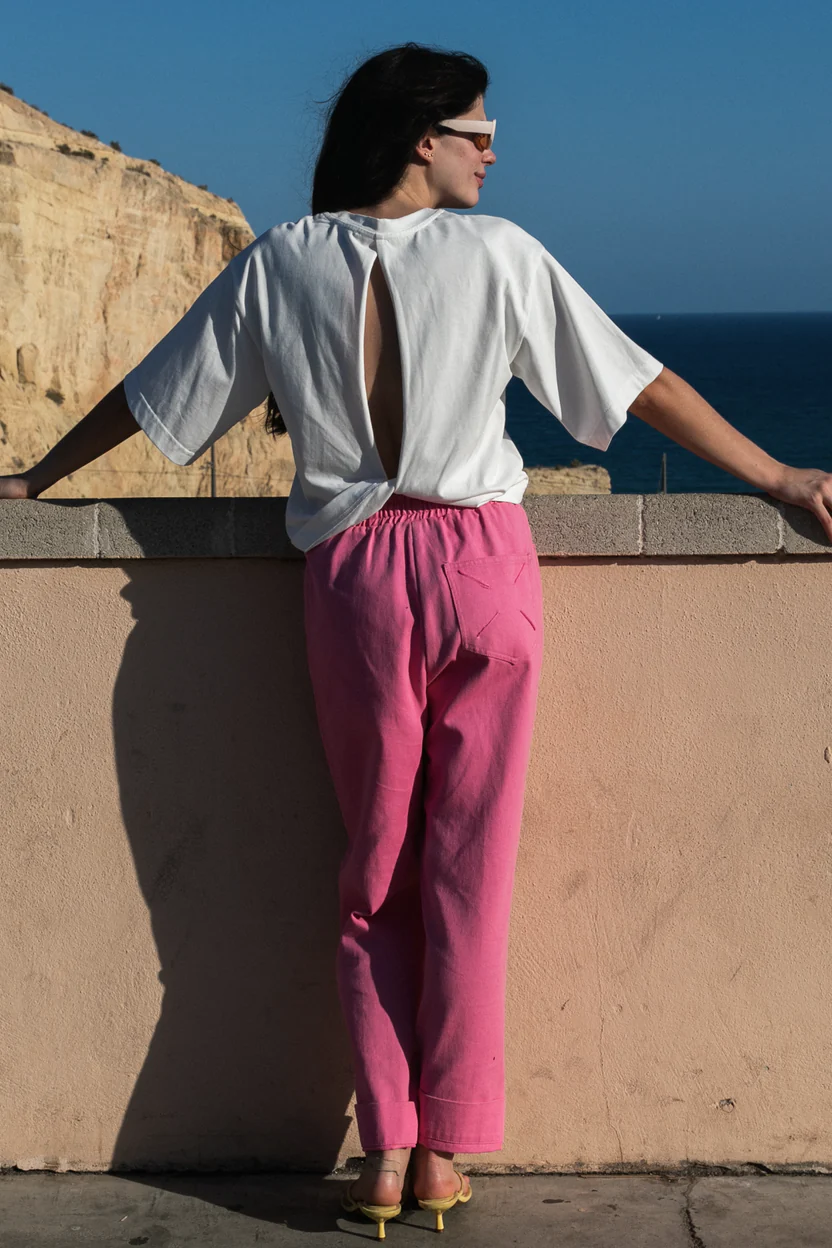 Oversize juste comme il faut, manches larges, tombé net. Il a cette allure un peu boyish qu’on adore, mais avec un twist inattendu. Quand vous vous retournez, le dos s’ouvre en une ligne verticale, discrète mais magnétique. Ce n’est pas un simple t-shirt blanc. C’est celui qui change tout.