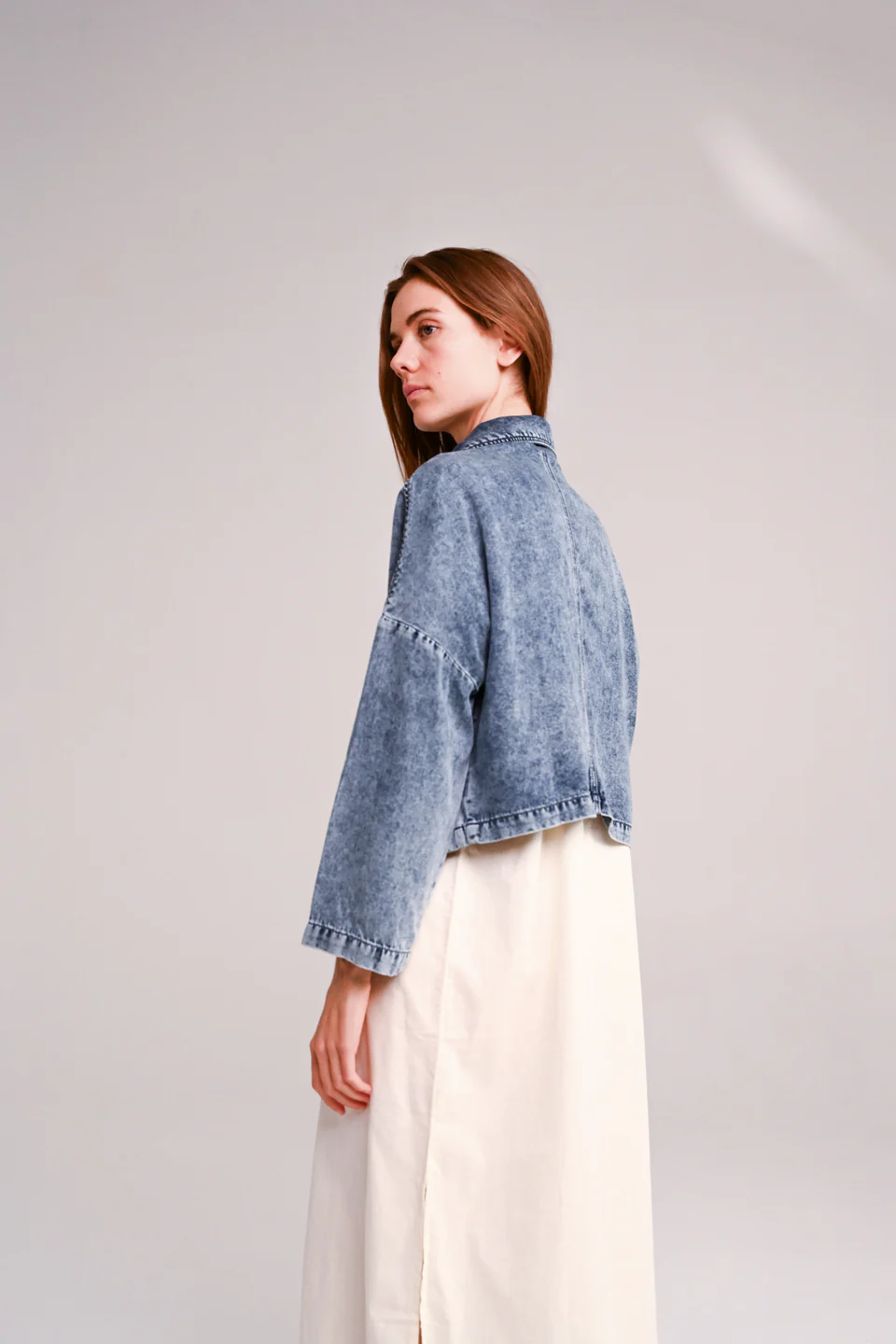 » Un vent de cool souffle sur cette veste en denim 100% coton. Avec son zip apparent, ses poches arrondies et ses manches larges, elle emprunte un style ultra cool aux pièces vintage des années 90. Son effet légèrement délavé lui donne cette patine unique, comme si elle avait déjà une histoire. Portez-la avec un pantalon taille haute pour équilibrer la coupe courte, ton sur ton avec un pantalon en jean pour un total look denim, ou encore ouverte sur une robe fluide pour casser les codes et jouer avec les contrastes. »