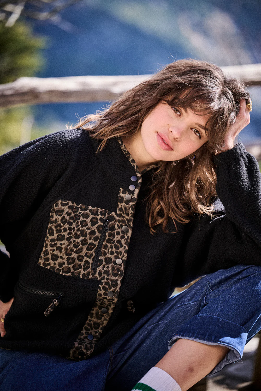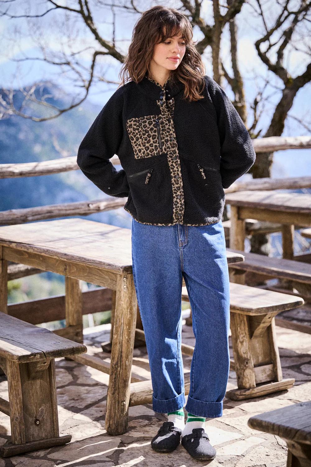 Une coupe oversize et un toucher tout doux côté noir uni. Mais twistée par des détails léopard qui viennent réveiller l’ensemble : empiècement poitrine, patte de boutonnage et poches contrastées.