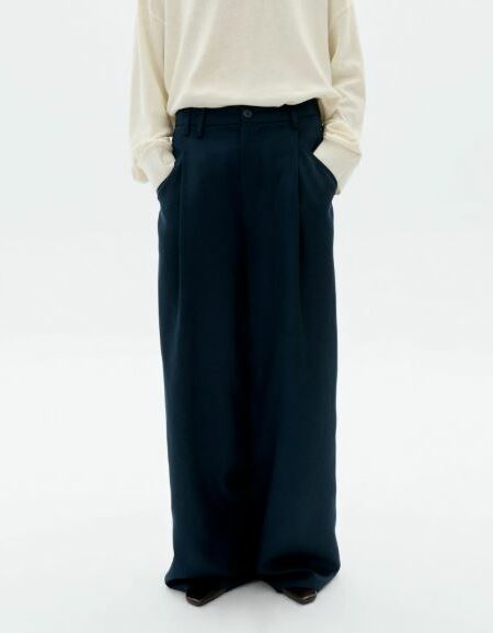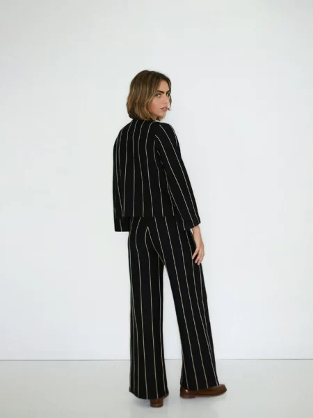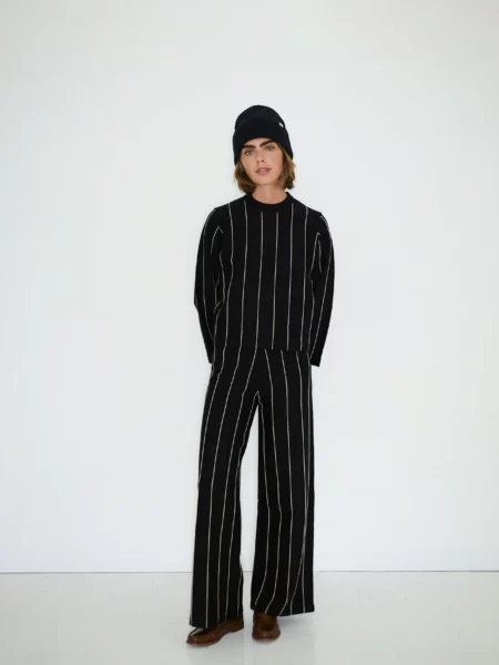 149,00€Pantalon en maille structurée bleu marine, en mélange de laine et de coton, avec rayures verticales texturées contrastantes. Coupe droite et décontractée avec ceinture côtelée. Une option intemporelle et confortable au quotidien. À associer au pull assorti pour une tenue coordonnée.