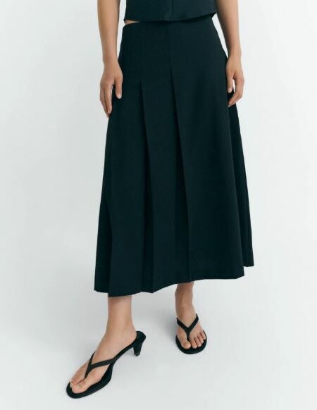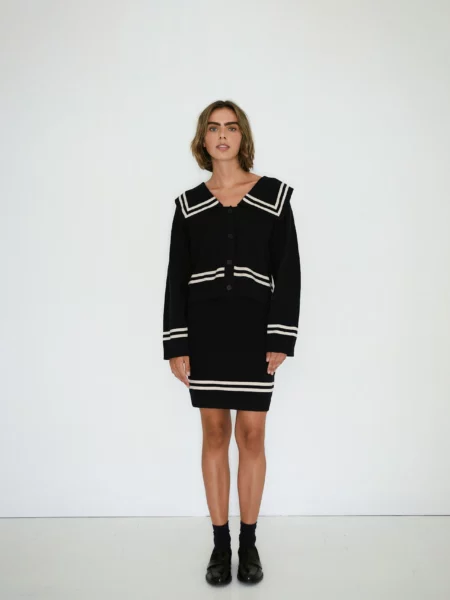 129,00€Jupe structurée en maille bleu marine, mélange laine et coton. Ceinture côtelée douce et ourlet contrasté. Silhouette ajustée, subtilement inspirée du style nautique.