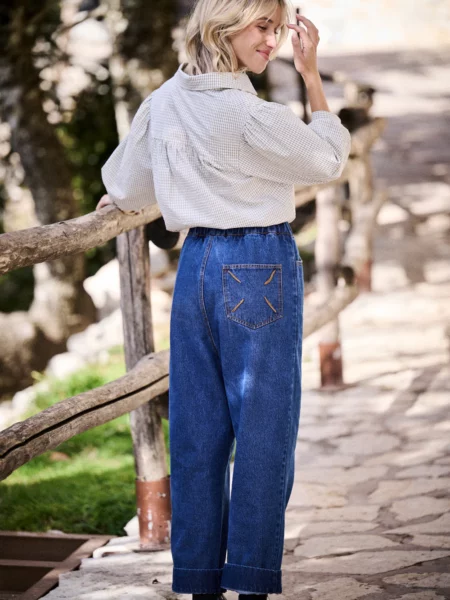 Le détail signature ? Une croix ton sur ton, brodée à la main sur la poche arrière. Un clin d’œil subtil imaginé par Laure pour apporter une touche d’originalité à ce pantalon du quotidien. -