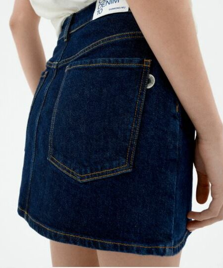 Nora a souhaité revisiter la jupe en jean en lui ajoutant une fermeture asymétrique et un short intégré, alliant style et confort en ville comme à la plage. -