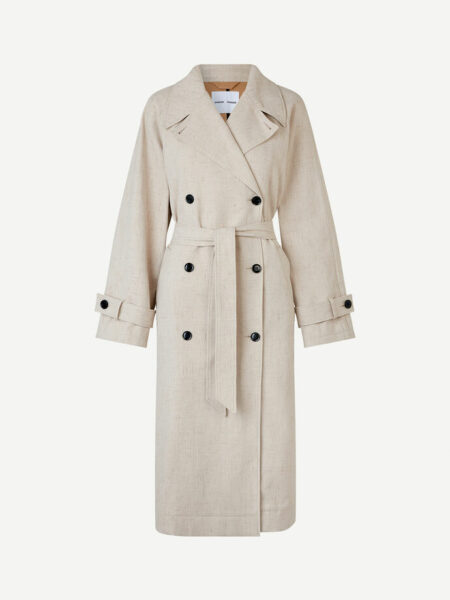 Trench à double boutonnage avec col à revers cranté. Sangles aux poignets, taille ceinturée, poches avant. Coutures intégrées.