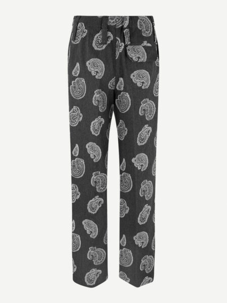 Pantalon couple classique, style jean. Poches arrondies à l’avant, poches plaquées à l’arrière, passepoil à l’arrière. Fermeture zippée avec bouton de jean, passants de ceinture. Mélange de coton et polyester avec un motif jacquard tissé.