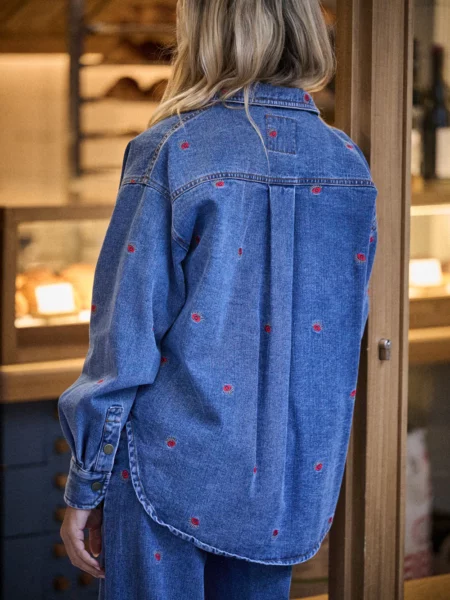 Une coupe un peu ample, un denim souple mais avec de la tenue, et ce petit twist qui change tout : le motif brodé, un petit œil rouge contre le mauvais œil, parsemé tout le long de la veste. Porte-bonheur discret ou clin d’œil stylé à vous de choisir.- • Surchemise en toile denim 100% coton