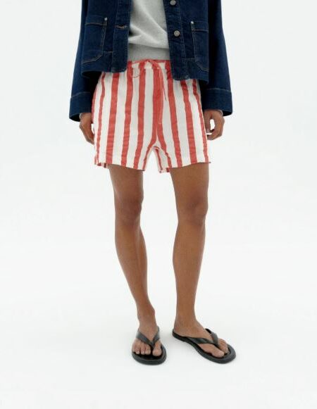 70,00€Le prix initial était : 70,00€.35,00€Le prix actuel est : 35,00€.Short rayé rouge Geranio en coton biologique.