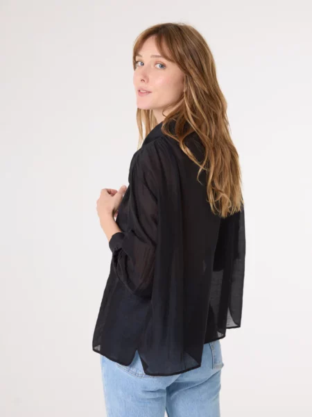 149,00€Le prix initial était : 149,00€.74,50€Le prix actuel est : 74,50€.Blouse féminine à manches longues, confectionnée dans un mélange voile de coton et soie. La coupe est ample et le tissu légèrement brillant. Côté détail on retrouve un col de chemise classique ainsi que des fronces aux épaules et en bas de manches.