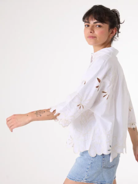 Poignets boutonnés. Froncée devant et dos. Bas de manches froncé.