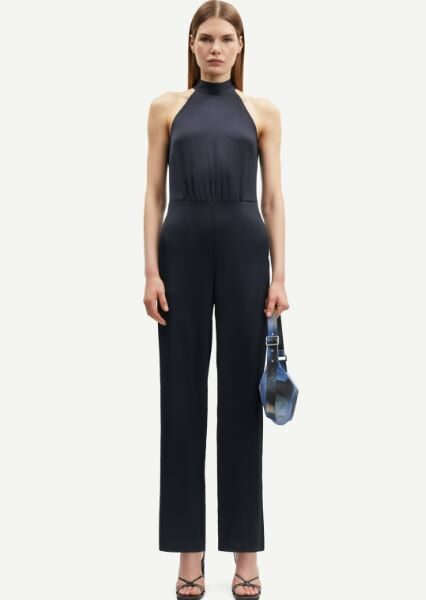 Combinaison en satin avec jambes droites, coupe ajustée. Fermeture zippée sur le côté et bretelles à nouer dans le dos. Poches latérales fendues. Matière principale : mélange élastique à base de polyester recyclé. Ce produit est certifié GRS. Chaque étape de la chaîne d’approvisionnement a répondu à des exigences sociales, environnementales et chimiques strictes.La longueur de la couture intérieure est 76,2 cm sur une taille S