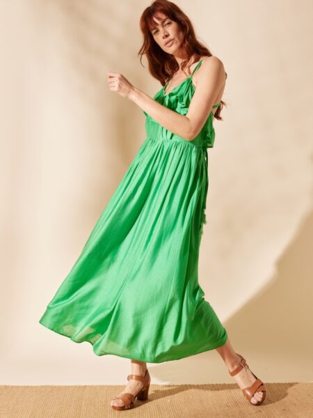 Robe longue à bretelles, dos nu, petit volant autour de l’encolure, tissu légèrement satiné